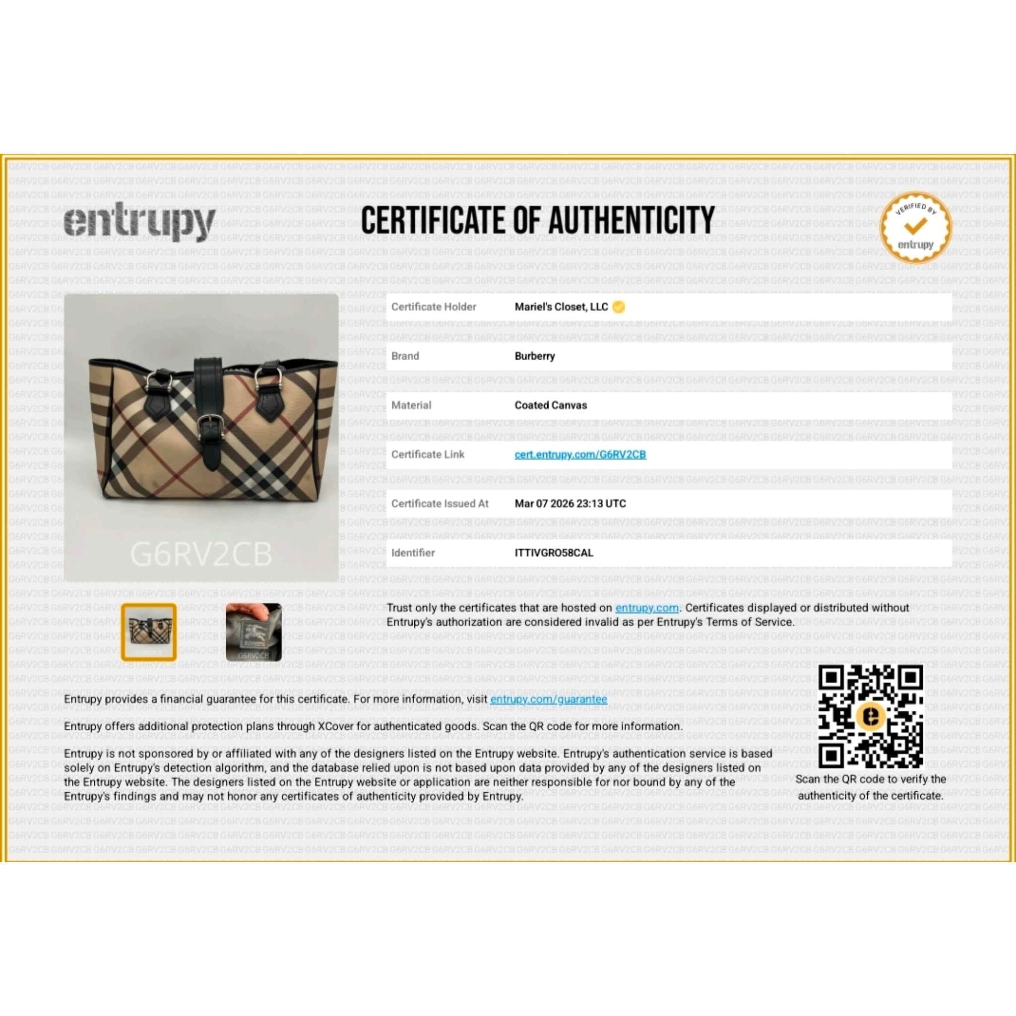 **Upon Purchase, Certificate of Authenticity from Entrupy will include**