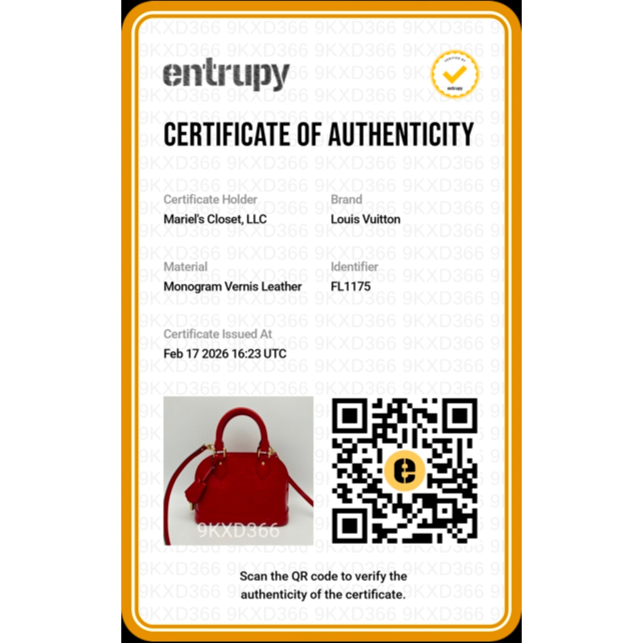 **Upon Purchase, Certificate of Authenticity from Entrupy will include**